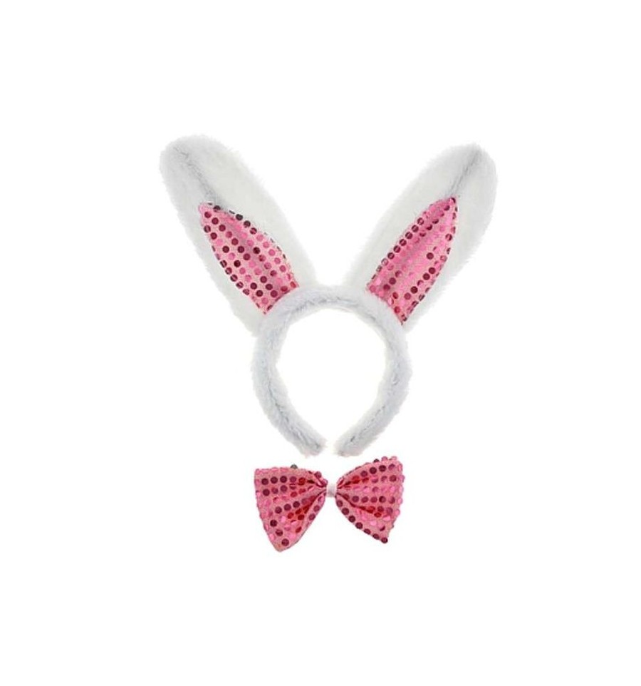 ✅Plastikowa opaska z białym pluszowym pokrowcem z dwoma wypustkami na uszy, które w środku mają mniejsze uszy w różowe cekiny + muszka w różowe cekiny.