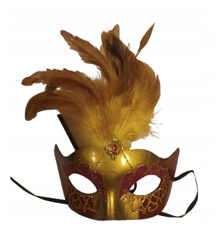 ✅Dodatkowo maskę zdobi złoty kamień oraz efektowny wachlarz z piór.