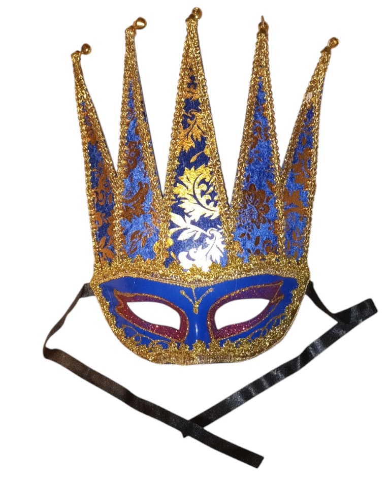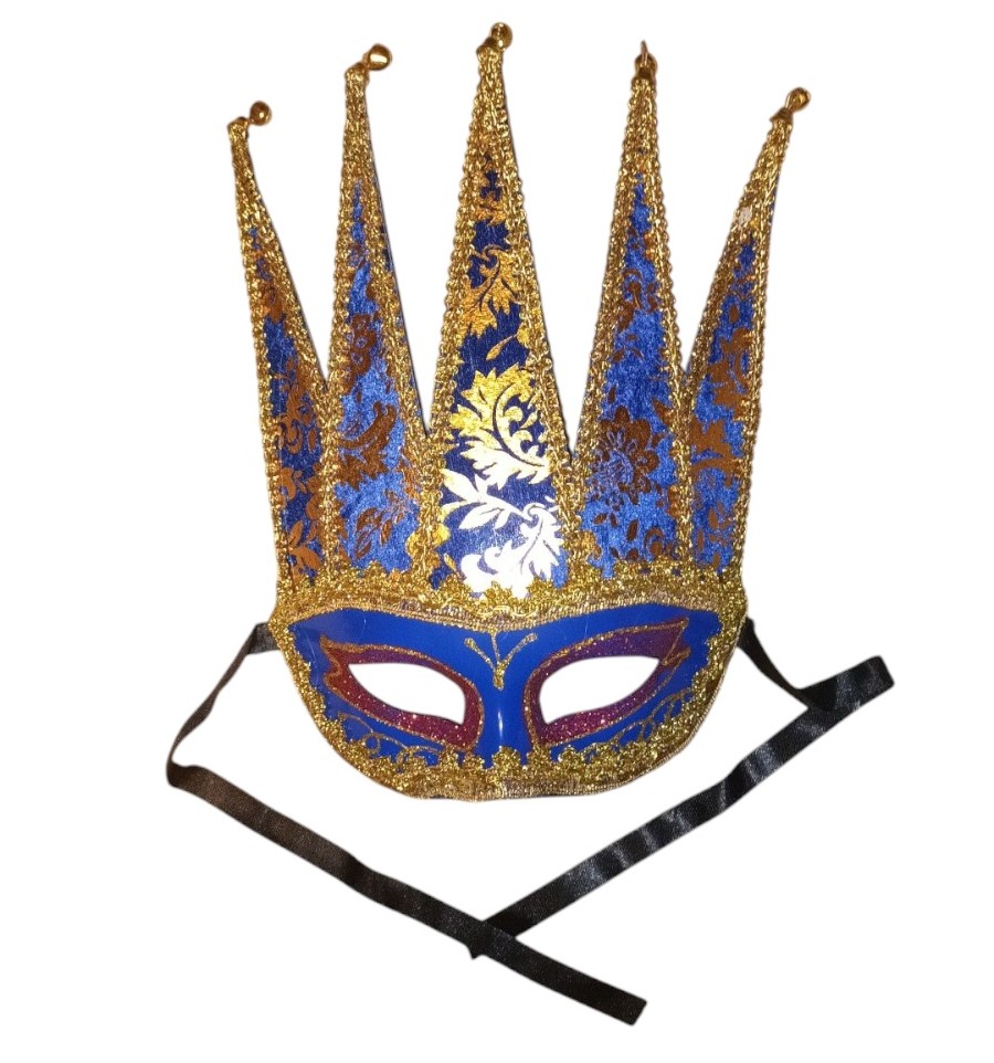✅Maska w kolorze Niebieskim ze złotymi i złotymi zdobieniami ,ozdobiona złotą wstążką.