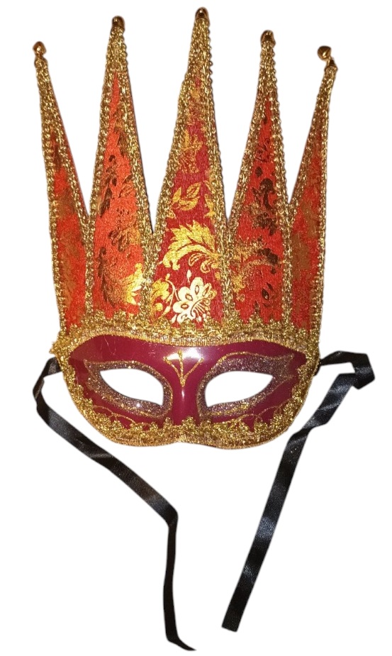 ✅Maska w kolorze czerwonym ze złotymi i czerwonymi zdobieniami ,ozdobiona złotą wstążką.